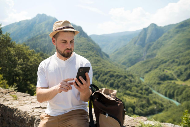 Foto: Ein Mann nutzt sein Smartphone, während er eine Berglandschaft erkundet –